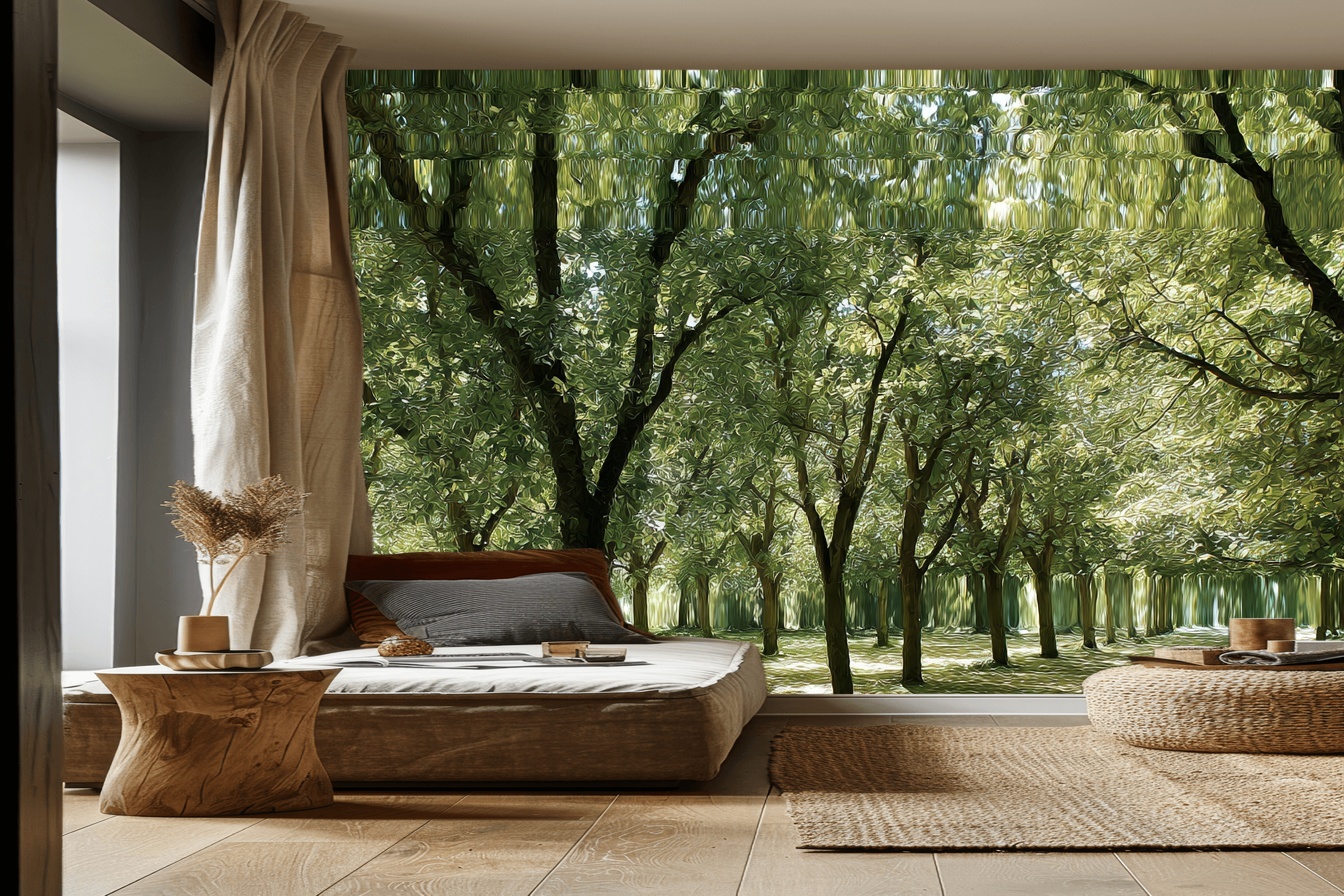 Breng de betovering van een bosrijke droomwereld in je huis met dit Enchanted Forest Dreamscape Wallpaper. Deze prachtige muurbedekking vangt het mysterie en de rust van een serene bosomgeving, waar de zon door het bladerdak filtert en zachte schaduwen werpt op de grond. Perfect voor het creëren van een ontspannende sfeer in je woon- of slaapkamer. Ervaar dagelijks de magie van de natuur vanuit het comfort van je eigen huis. Laat je verrassen door de diepe kleuren en de rustgevende uitstraling die deze wandbekleding biedt.