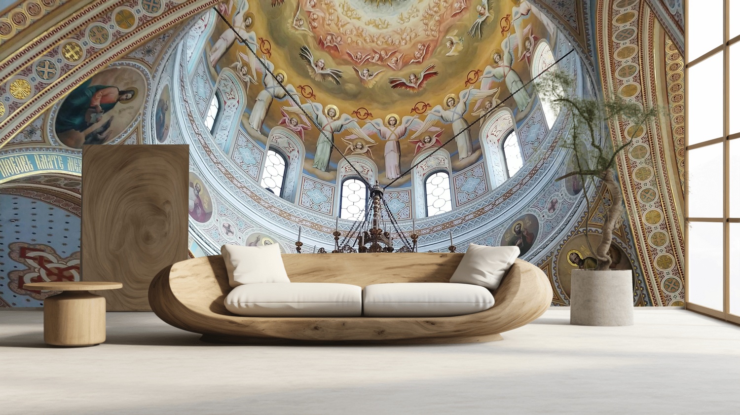 Laat je betoveren door de ‘Hemelse Kerkschoonheid op Plafondbehang’, waar elke blik omhoog een reis is naar een andere wereld. Dit behang brengt de majestueuze pracht van een rijk gedecoreerd kerkplafond direct in je woonkamer, met weelderige details en een ingewikkeld ontwerp dat eeuwenoude meesterwerken weerspiegelt. De warme gouden en zachte blauwe tinten stralen een serene en heilige sfeer uit, ideaal om een rustig toevluchtsoord in je eigen huis te creëren. Droom weg bij de subtiele lichtinval door de luchtige koepel en laat je inspireren door de grandeur en geschiedenis die in elk penseelstreekje gevangen zit. Met dit behang transformeer je elke kamer tot een heiligdom van schoonheid en rust.