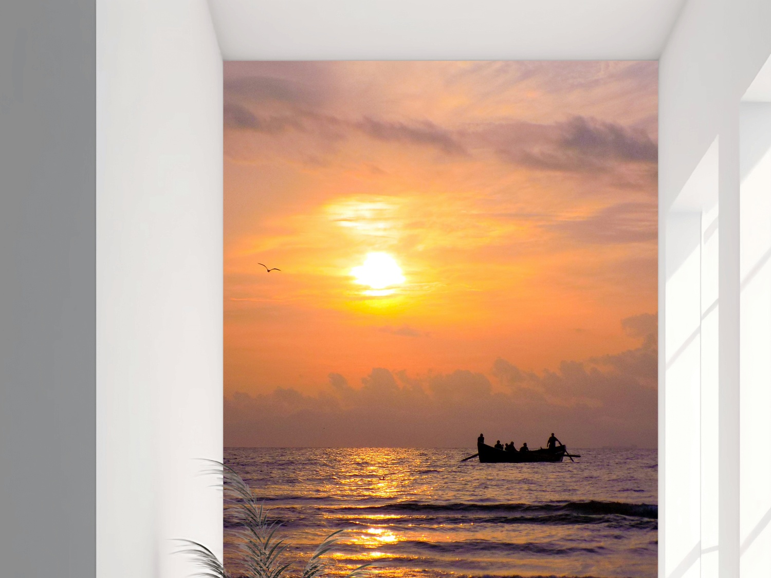 Laat je meevoeren naar een wereld van serene kalmte met de ‘Zee van Rust in Zonsondergang’. Deze adembenemende muurschildering vangt de stilte van de avond op zee, waar een eenzame boot zachtjes over de golven glijdt. De warme tinten van de ondergaande zon creëren een gevoel van vrede en reflectie, terwijl de zachte kleuren de ruimte vullen met een ontspannen sfeer. De ‘Zee van Rust in Zonsondergang’ is perfect om een vleugje natuurlijke schoonheid in je huis te brengen en elke kamer om te toveren tot een oase van rust.